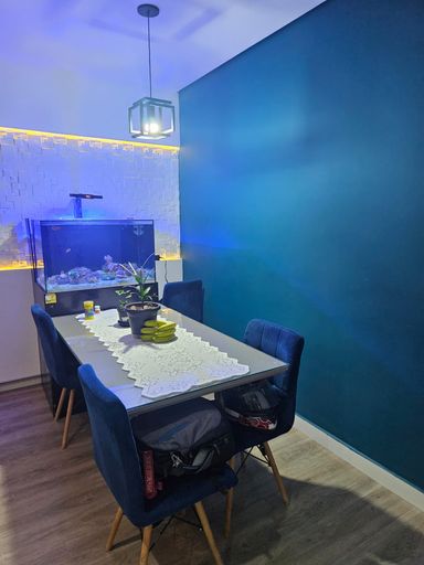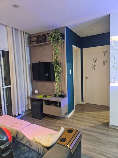 O ambiente social é um dos grandes destaques, com a sala de estar e a cozinha integradas sob um elegante projeto luminotécnico. O teto conta com rebaixamento em gesso e sanca com iluminação em LED embutida, criando uma atmosfera acolhedora e moderna. A varanda privativa complementa o espaço, garantindo excelente ventilação natural e um local perfeito para relaxar.
