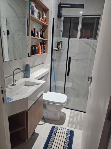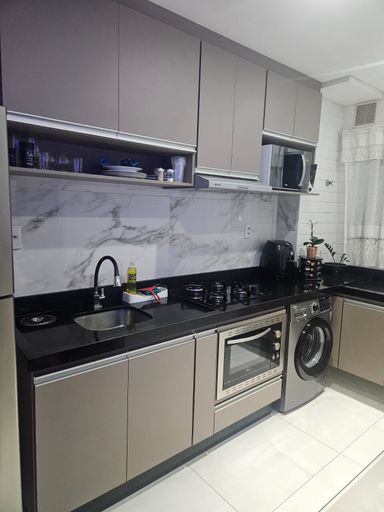 A cozinha é totalmente funcional, equipada com bancadas em granito de alta qualidade, cooktop já instalado e forno embutido. Toda a marcenaria foi feita sob medida, com móveis planejados presentes em todos os cômodos, otimizando cada metro quadrado com elegância. No banheiro, o cuidado com os detalhes continua, apresentando box em vidro temperado (blindex) e acabamentos impecáveis.